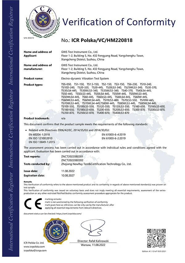 GWS focuses on designing and manufacturing electrodynamic vibration test equipment. We have developed specialized technologies and hold patents related to vibration testing control, performance optimization, and structural design. Our testing equipment range includes electrodynamic shakers available in air-cooled and water-cooled configurations, supporting vertical and horizontal excitation, as well as combined motion. These vibration test systems cover force ratings from 500 N (50 kg) to 600 kN (60 tons) and can be tailored for standard laboratory use or customized to meet specific requirements in research and production environments. Our environmental testing equipment is widely used in automotive component validation, aerospace reliability testing, electronic device qualification, and many other industrial applications.